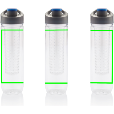 Trendig vattenflaska i miljösmart Tritan, 800ml, med inbyggd fruktbehållare som tillför ditt vatten både vitaminer och smak. Fruktbehållaren kan också användas för att kyla ner vattnet genom att lägga i iskuber.