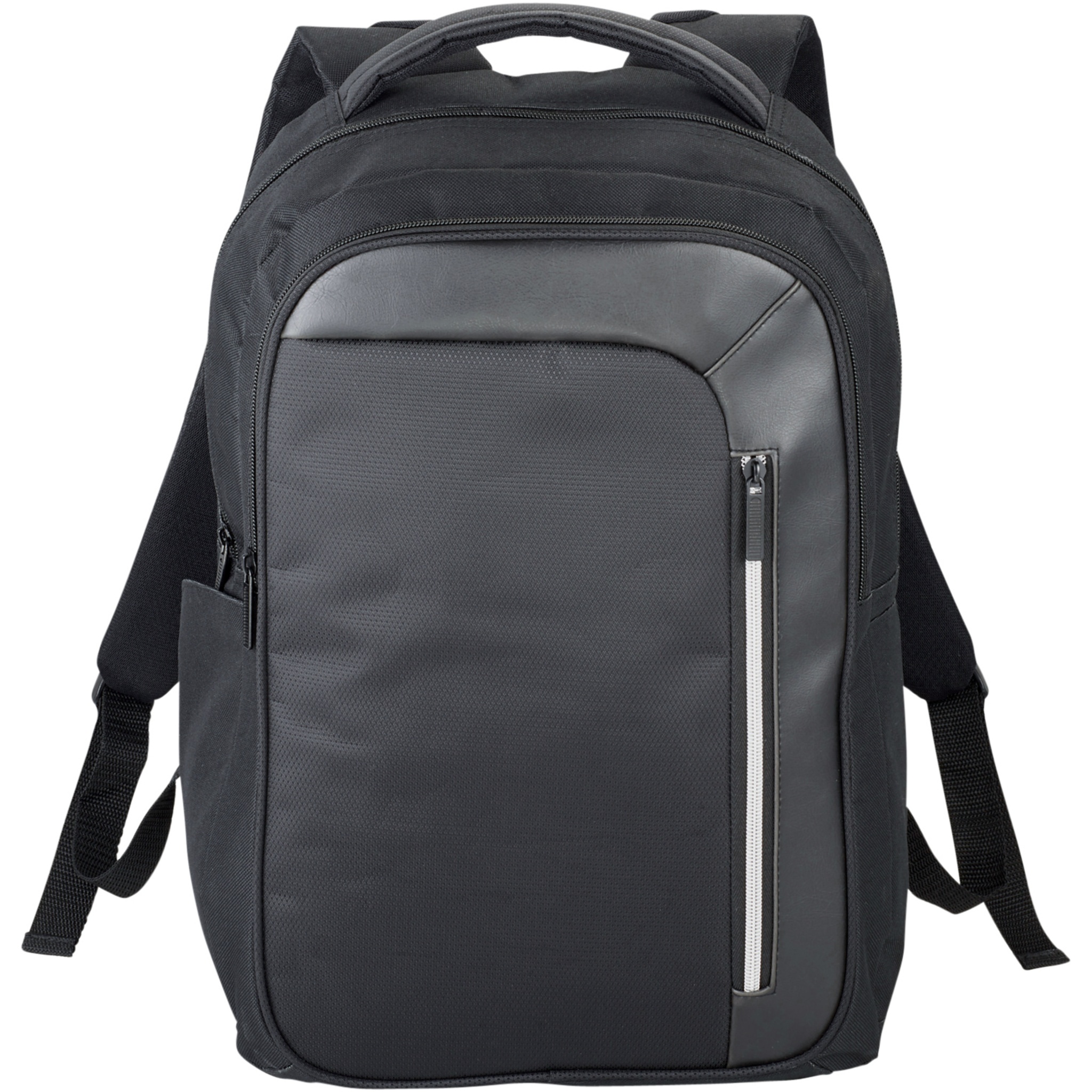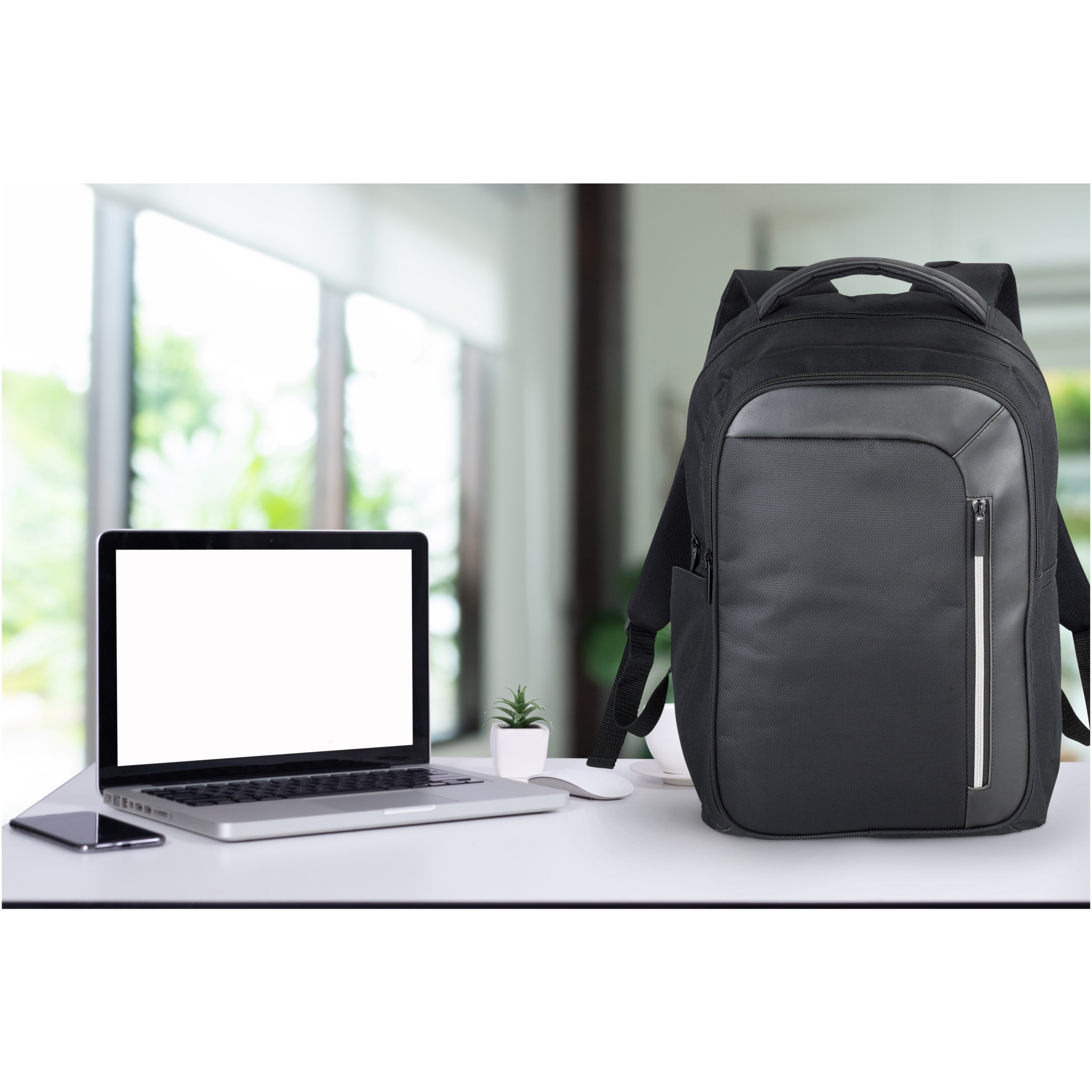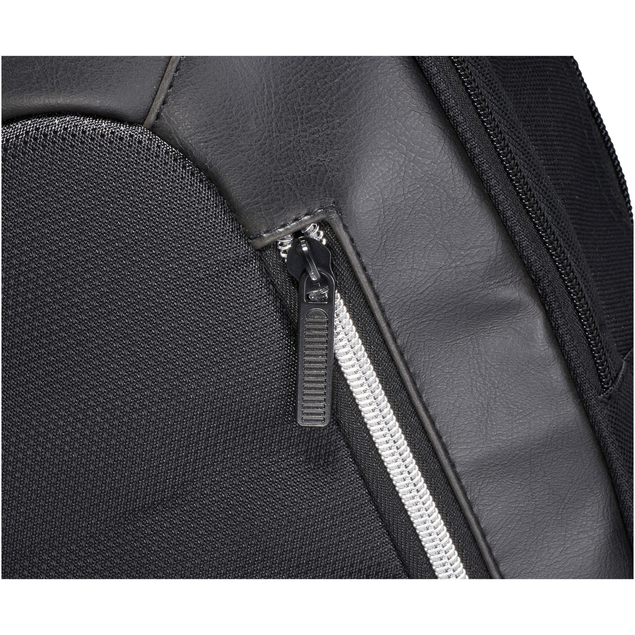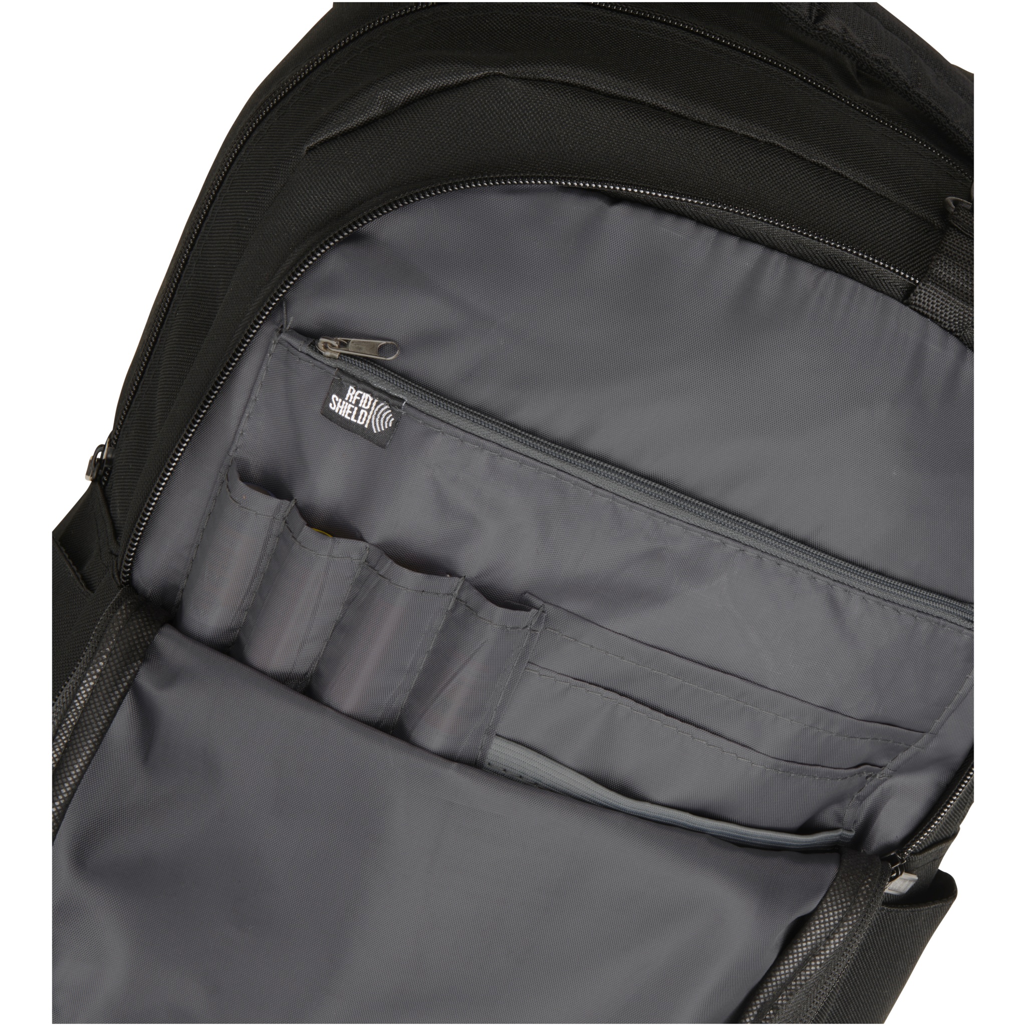 Elegant trendig ryggsäck med en stor blixtlåsficka fram och nyckelbrickshållare. Dold RFID-blockeringsteknik skyddar dina kort och pass från identitetsstöld. Stort fack med dragkedja till 15" laptop och ett separat vadderat fack för surfplattan. Vertikal dragkedja som ger dig snabb tillgång till den främre fickan. Två sidfickor. Justerbara vadderade axelband med detaljer för att fästa andra resetillbehör. Bärhandtag och trollband som gör resandet smidigt. Det kan finnas mindre variationer i färgen på den faktiska produkten på grund av tygfärgerna, vävar och utskriften.
